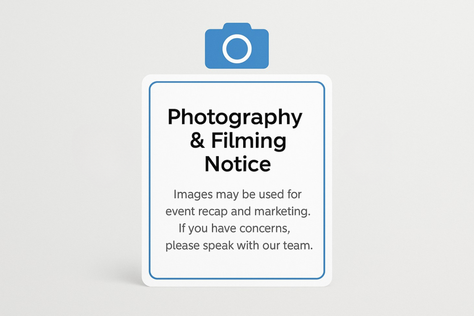 The first step is to be upfront. Tell guests that photography and filming will take place. You can mention it in the registration confirmation email, display signs prominently at entrances and have your emcee give a brief reminder at the start of the day. The wording can stay friendly and clear. For example, “Photography and filming are taking place at this event. Images may be used in our event recap and future marketing”