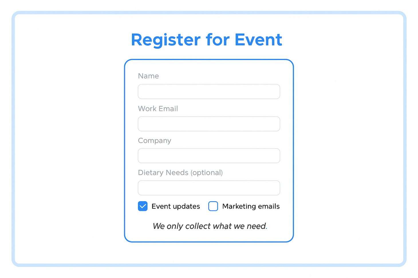 Start with a clear explanation of why you are collecting data. A short line above the form fields can do the job. For example, “We use your details to manage your registration, send event updates and share information related to this event.” If you want to send future marketing that is not tied to this event, say so separately and make it opt-in.