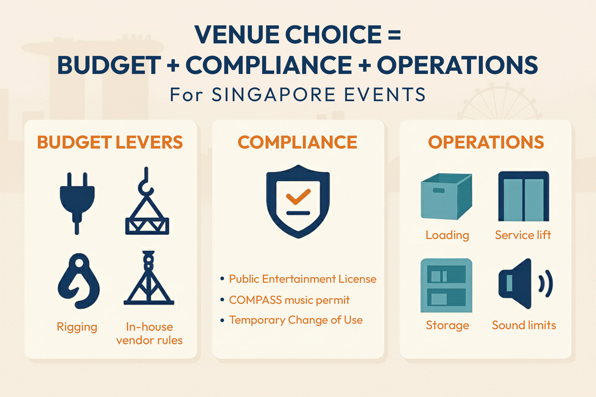 Your choice of venue is not merely a stylistic decision. It determines the event budget and the commute experience will be for your team and guests. For budget, the most significant line items are venue rental, booth setup + teardown, power distribution, rigging, security, general liability insurance and cleaning. On compliance, programmes that count as public entertainment need a Public Entertainment Licence, copyrighted music played in public usually needs a COMPASS permit, and layouts that add tentage or booths often need a Temporary Change of Use approval from SCDF. Take note of loading bay access, service-lift dimensions and setup and teardown windows.