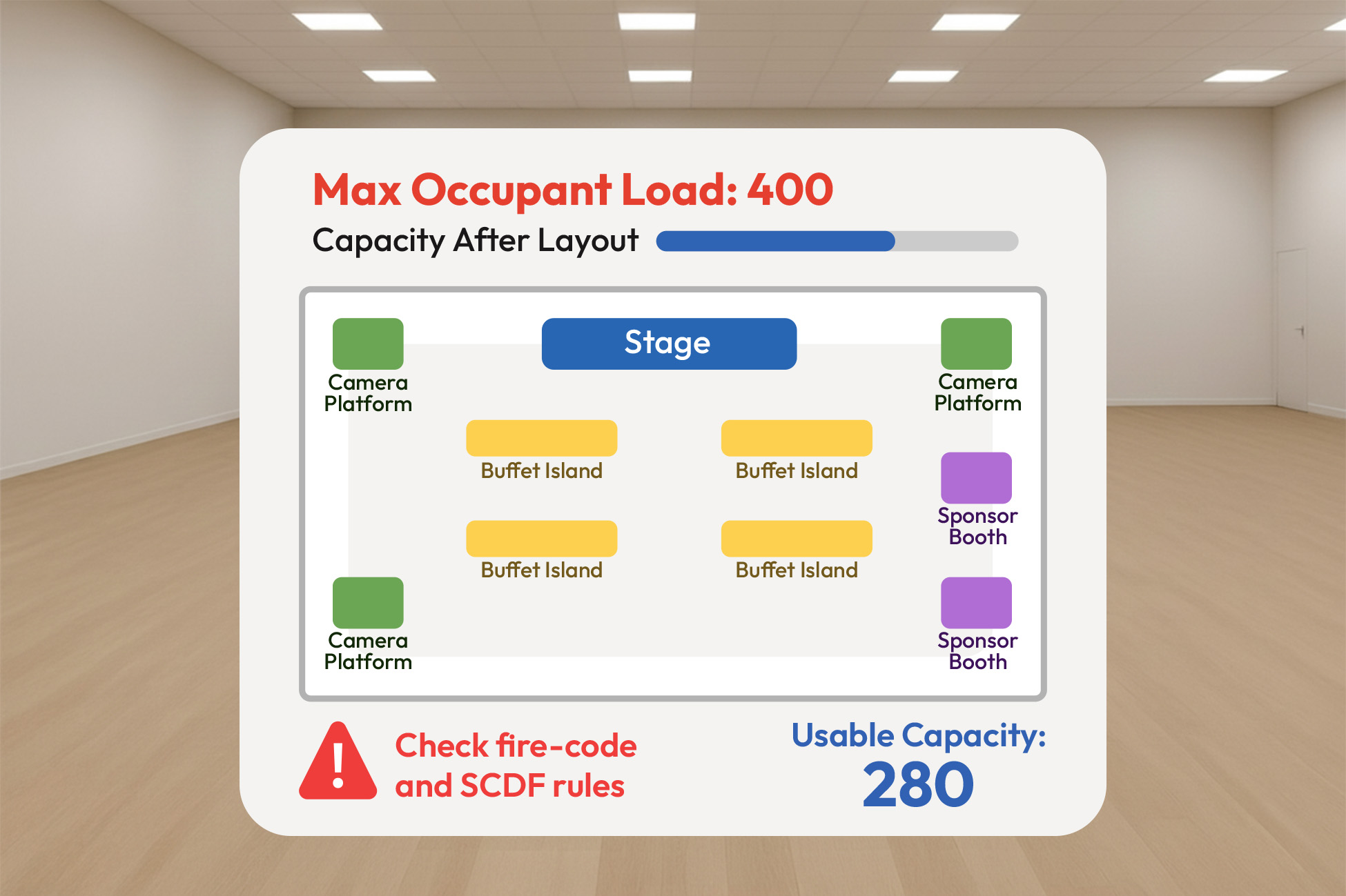 Start from the venue’s suggested occupant load, deduct the stage and technical platforms, place catering and sponsor islands, then recheck aisle widths and clearances. For indoor booths or outdoor tentage, verify the relevant SCDF conditions before you finalise the plan. (SCDF)